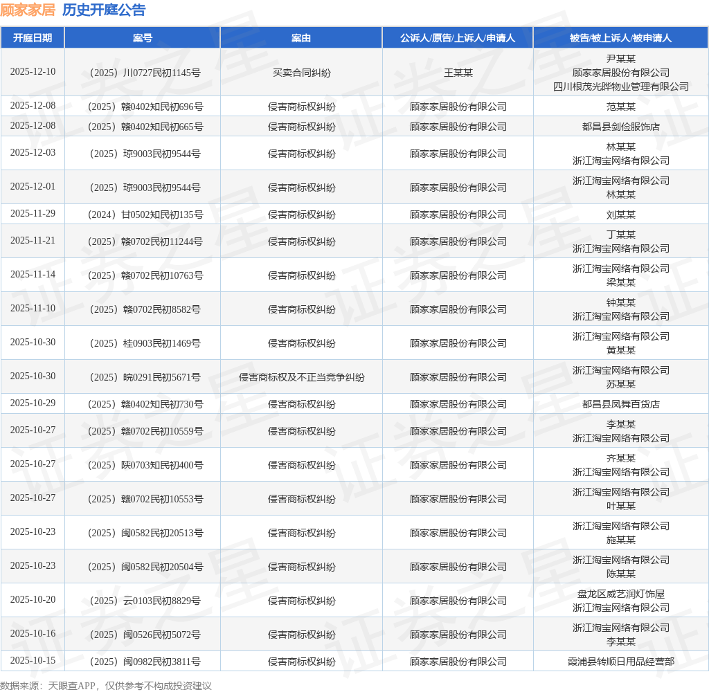 案号:(2025)桂0903民初1469号根据统计,近一年内以顾家家居股份有限公司为当事人的历史开庭公告有196则,其中案由为“侵害商标权纠纷”的公告以158则居首,其次为“买卖合同纠纷”有8则,“商标权权属、侵权纠纷”有7则。历史开庭公告(前20条)如下:
