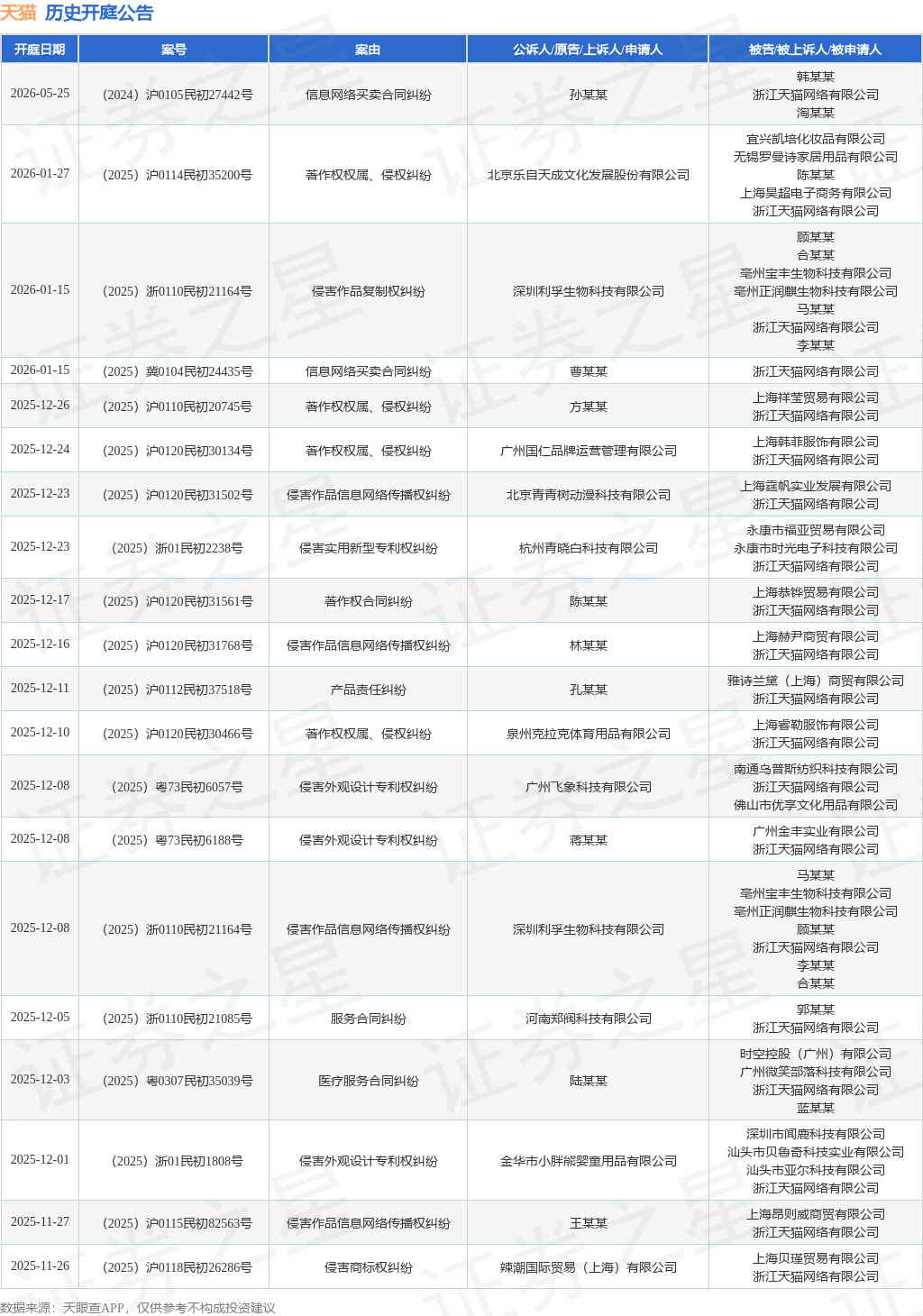案号:(2025)浙0110民初27006号根据统计,近一年内以浙江天猫网络有限公司为当事人的历史开庭公告有2294则,其中案由为“著作权权属、侵权纠纷”的公告以558则居首,其次为“侵害商标权纠纷”有380则,“侵害外观设计专利权纠纷”有349则。历史开庭公告(前20条)如下: