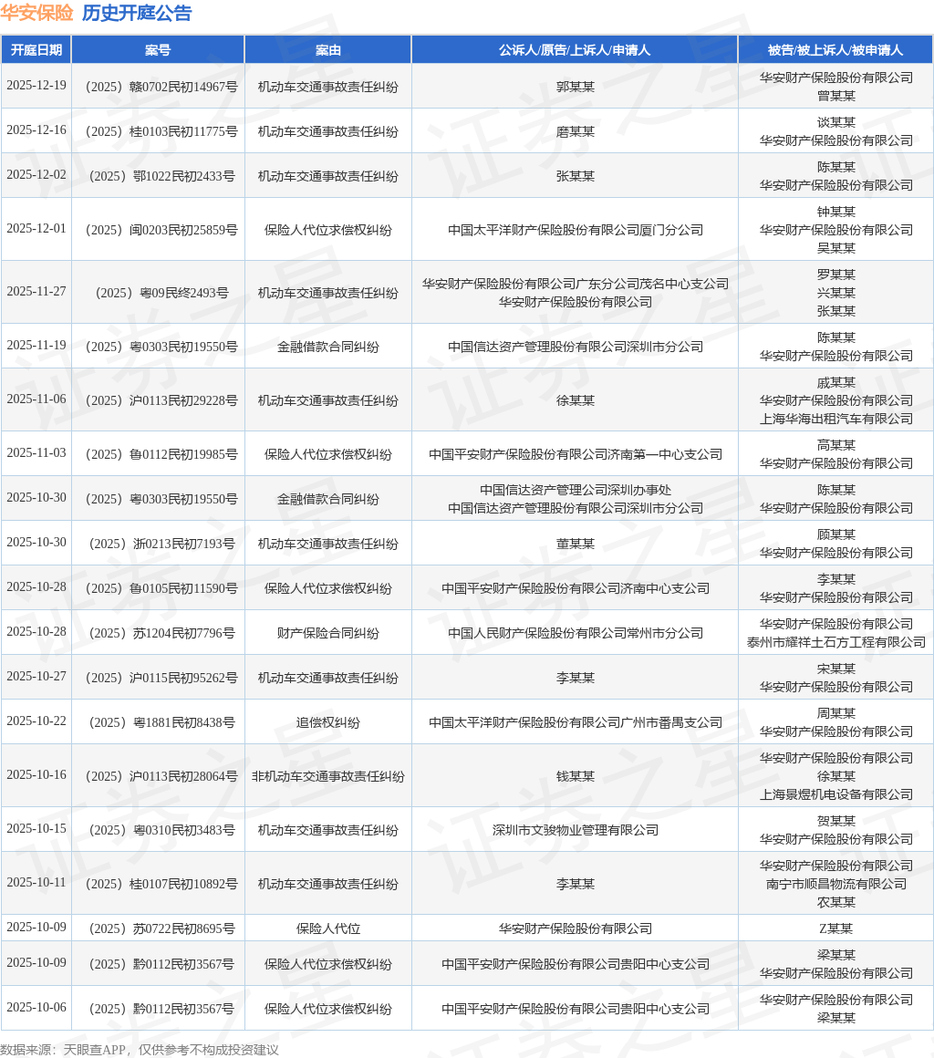 案号:(2025)粤0303民初19550号根据统计,近一年内以华安财产保险股份有限公司为当事人的历史开庭公告有267则,其中案由为“机动车交通事故责任纠纷”的公告以145则居首,其次为“保险人代位求偿权纠纷”有41则,“财产保险合同纠纷”有15则。历史开庭公告(前20条)如下: