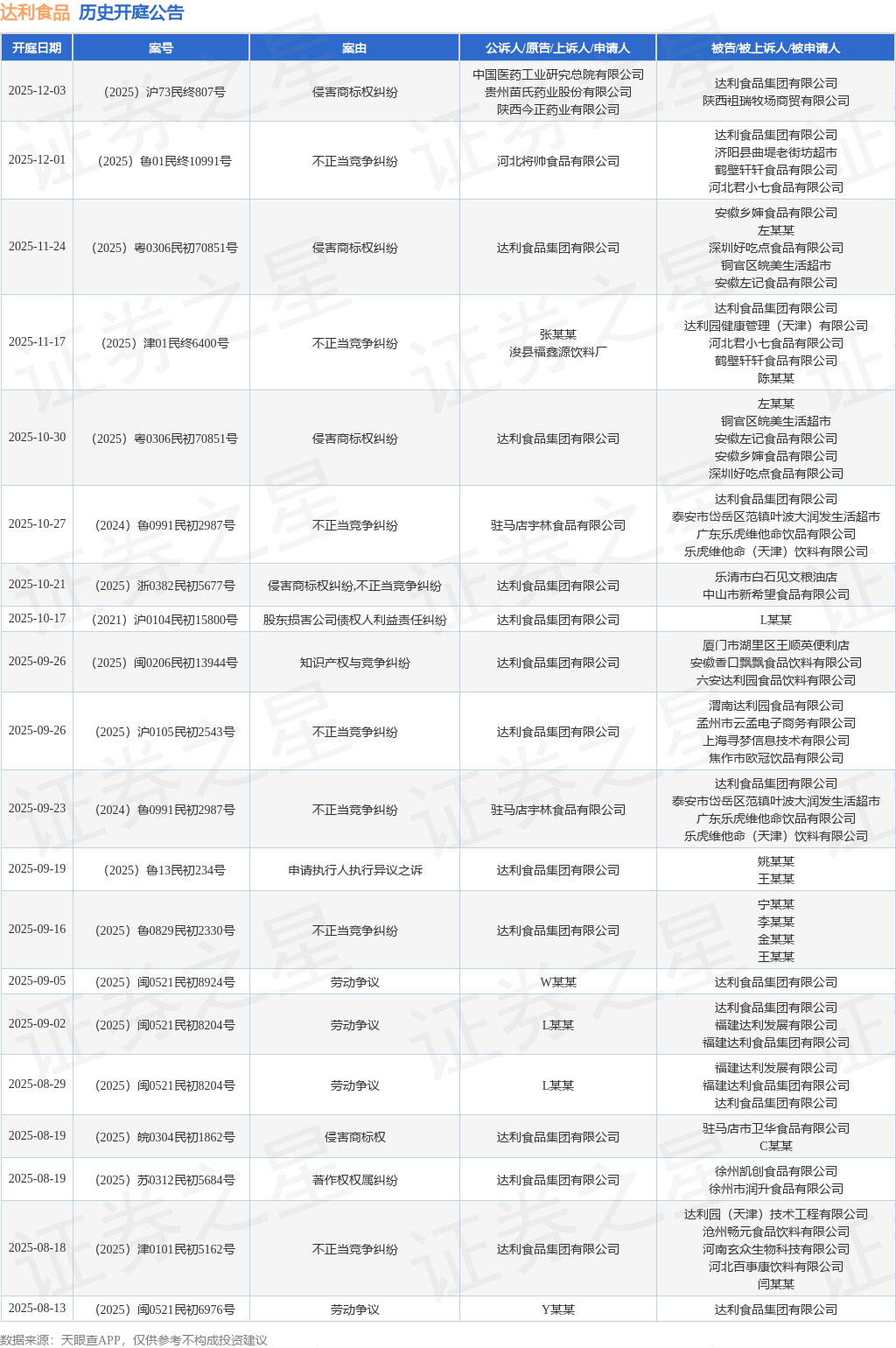 案号:(2025)粤0306民初70851号根据统计,近一年内以达利食品集团有限公司为当事人的历史开庭公告有81则,其中案由为“不正当竞争纠纷”的公告以29则居首,其次为“侵害商标权纠纷”有17则,“劳动争议”有11则。历史开庭公告(前20条)如下: