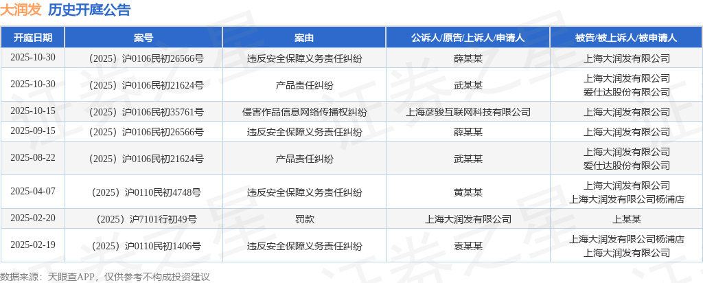 案号:(2025)沪0106民初21624号根据统计,近一年内以上海大润发有限公司为当事人的历史开庭公告有8则,其中案由为“违反安全保障义务责任纠纷”的公告以4则居首,其次为“产品责任纠纷”有2则,“侵害作品信息网络传播权纠纷”有1则。历史开庭公告如下: