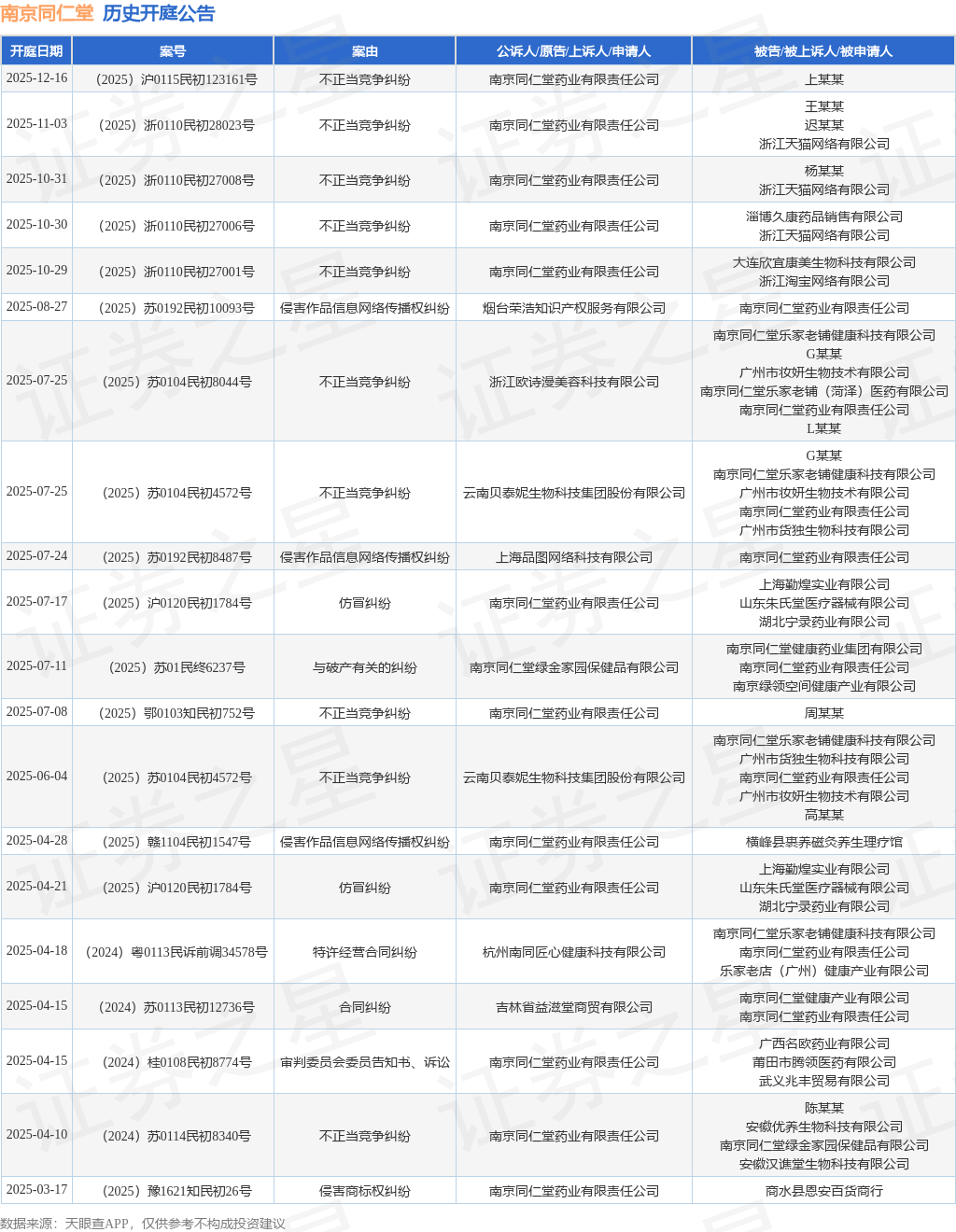 案号:(2025)浙0110民初27006号根据统计,近一年内以南京同仁堂药业有限责任公司为当事人的历史开庭公告有43则,其中案由为“不正当竞争纠纷”的公告以21则居首,其次为“侵害商标权纠纷”有5则,“与破产有关的纠纷”有3则。历史开庭公告(前20条)如下: