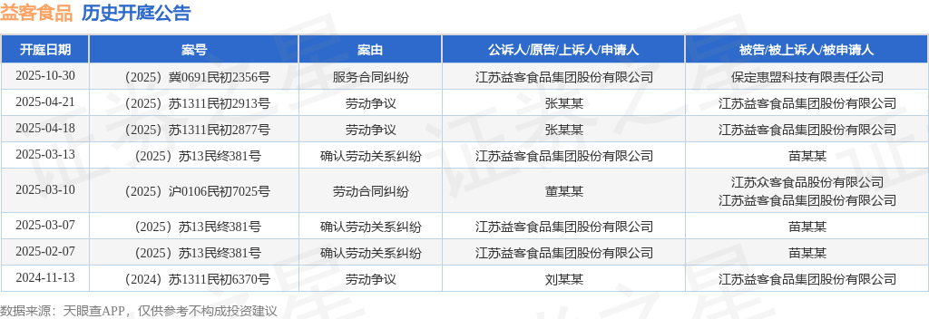 案号:(2025)冀0691民初2356号根据统计,近一年内以江苏益客食品集团股份有限公司为当事人的历史开庭公告有8则,其中案由为“劳动争议”的公告以3则居首,其次为“确认劳动关系纠纷”有3则,“劳动合同纠纷”有1则。历史开庭公告如下: