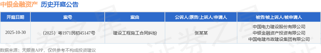 根据统计,近一年内以中银金融资产投资有限公司为当事人的历史开庭公告有1则,其中案由为“建设工程施工合同纠纷”的公告以1则居首。历史开庭公告如下: