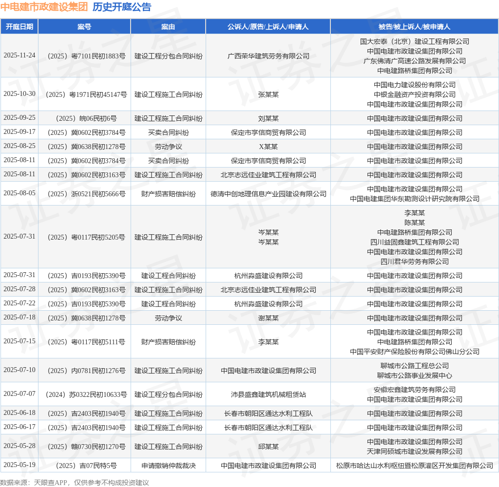 案号:(2025)粤1971民初45147号根据统计,近一年内以中国电建市政建设集团有限公司为当事人的历史开庭公告有50则,其中案由为“建设工程施工合同纠纷”的公告以15则居首,其次为“买卖合同纠纷”有10则,“建设工程合同纠纷”有6则。历史开庭公告(前20条)如下: