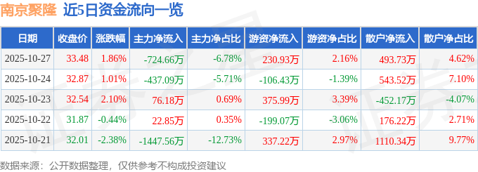 证券之星消息,截至2025年10月27日收盘,南京聚隆(300644)报收于33.48元,上涨1.86%,换手率3.64%,成交量3.22万手,成交额1.07亿元。