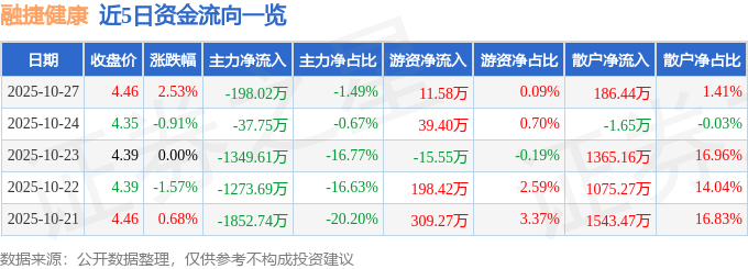 证券之星消息,截至2025年10月27日收盘,融捷健康(300247)报收于4.46元,上涨2.53%,换手率3.68%,成交量29.56万手,成交额1.33亿元。