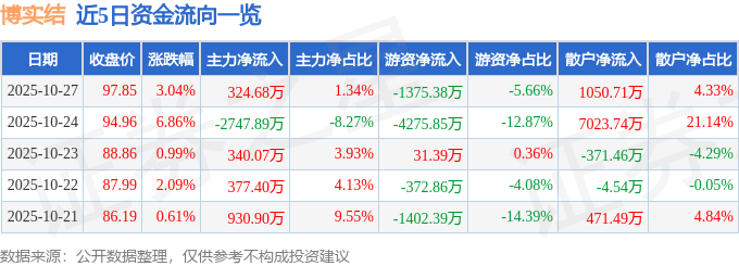 证券之星消息,截至2025年10月27日收盘,博实结(301608)报收于97.85元,上涨3.04%,换手率6.29%,成交量2.51万手,成交额2.43亿元。