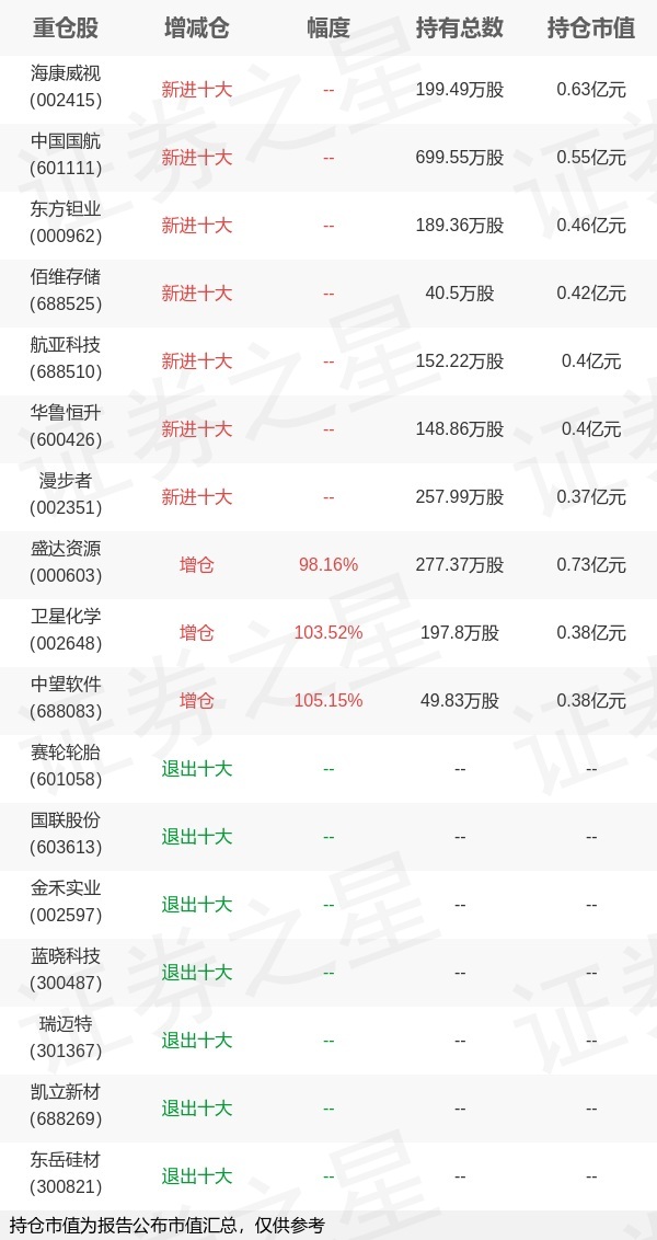 证券之星消息,10月27日招商基金旗下滕越 夏里鹏管理的招商信用增强债券型基金公布三季报,近1年净值增长率7.78%。与上一季度相比,该基金前十大重仓股新增海康威视,中国国航,东方钽业,佰维存储,航亚科技,华鲁恒升,漫步者;并对盛达资源增仓137.4万股,为该基金第一大重仓股;赛轮轮胎,国联股份,金禾实业,蓝晓科技,瑞迈特,凯立新材,东岳硅材等退出前十大重仓股;详细数据如下: