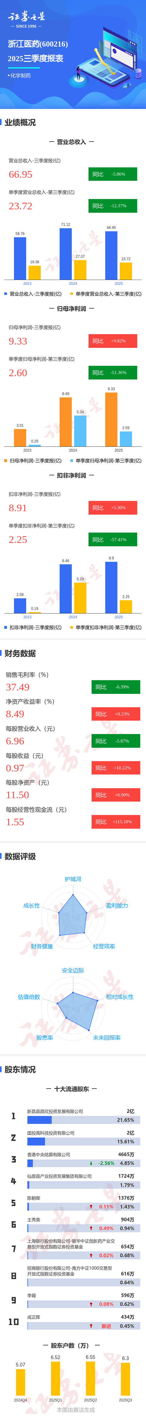 证券之星消息,浙江医药2025年三季报显示,公司主营收入66.95亿元,同比下降5.87%;归母净利润9.33亿元,同比上升9.83%;扣非净利润8.91亿元,同比上升5.3%;其中2025年第三季度,公司单季度主营收入23.72亿元,同比下降12.37%;单季度归母净利润2.6亿元,同比下降51.37%;单季度扣非净利润2.25亿元,同比下降57.41%;负债率20.69%,投资收益536.49万元,财务费用-9326.39万元,毛利率37.49%。
