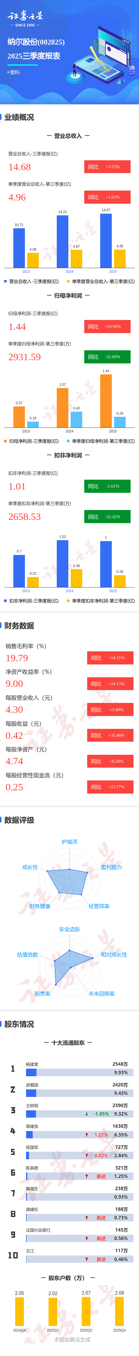 证券之星消息,纳尔股份2025年三季报显示,公司主营收入14.68亿元,同比上升3.25%;归母净利润1.44亿元,同比上升33.95%;扣非净利润1.01亿元,同比下降1.61%;其中2025年第三季度,公司单季度主营收入4.96亿元,同比上升1.63%;单季度归母净利润2931.59万元,同比下降32.61%;单季度扣非净利润2658.53万元,同比下降32.42%;负债率41.09%,投资收益6666.57万元,财务费用-923.34万元,毛利率19.79%。