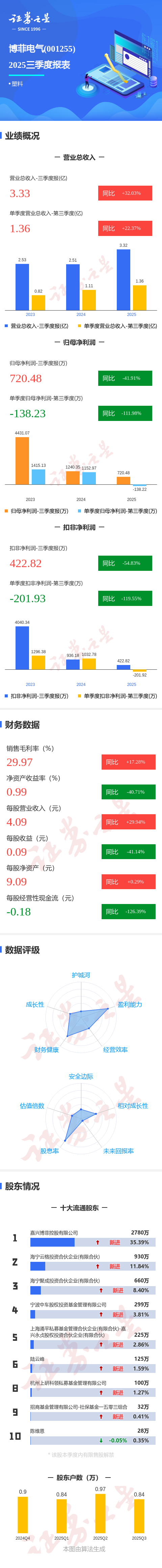 证券之星消息,博菲电气2025年三季报显示,公司主营收入3.33亿元,同比上升32.03%;归母净利润720.48万元,同比下降41.91%;扣非净利润422.82万元,同比下降54.84%;其中2025年第三季度,公司单季度主营收入1.36亿元,同比上升22.38%;单季度归母净利润-138.23万元,同比下降111.99%;单季度扣非净利润-201.93万元,同比下降119.55%;负债率47.4%,投资收益-31.41万元,财务费用338.91万元,毛利率29.97%。