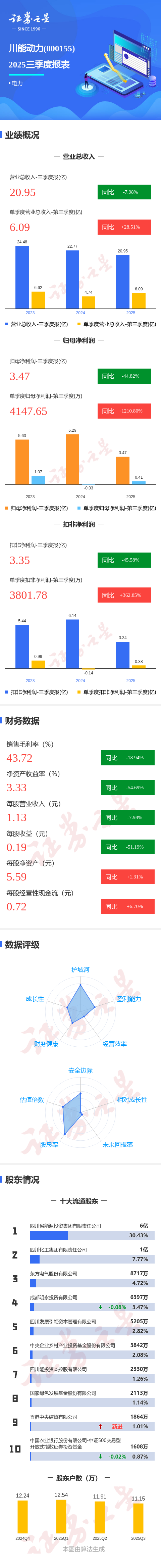 证券之星消息,川能动力2025年三季报显示,公司主营收入20.95亿元,同比下降7.98%;归母净利润3.47亿元,同比下降44.83%;扣非净利润3.35亿元,同比下降45.59%;其中2025年第三季度,公司单季度主营收入6.09亿元,同比上升28.52%;单季度归母净利润4147.65万元,同比上升1210.8%;单季度扣非净利润3801.78万元,同比上升362.85%;负债率55.09%,投资收益330.28万元,财务费用1.56亿元,毛利率43.72%。