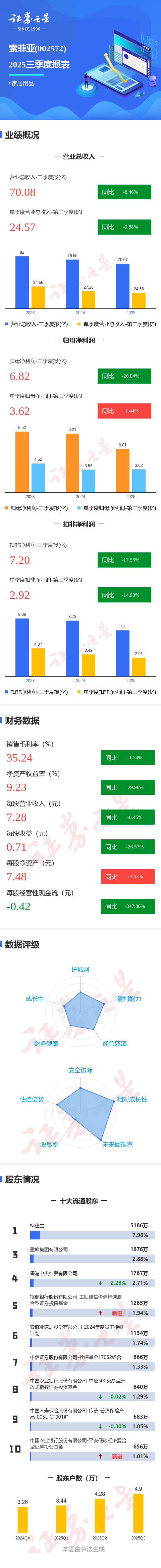 证券之星消息,索菲亚2025年三季报显示,公司主营收入70.08亿元,同比下降8.46%;归母净利润6.82亿元,同比下降26.05%;扣非净利润7.2亿元,同比下降17.56%;其中2025年第三季度,公司单季度主营收入24.57亿元,同比下降9.88%;单季度归母净利润3.62亿元,同比上升1.44%;单季度扣非净利润2.92亿元,同比下降14.83%;负债率45.1%,投资收益1445.51万元,财务费用1865.88万元,毛利率35.24%。