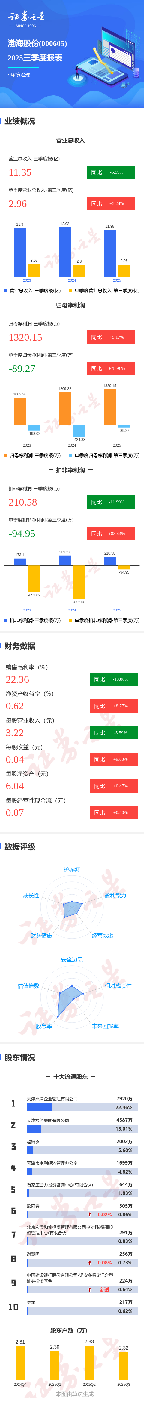 证券之星消息,渤海股份2025年三季报显示,公司主营收入11.35亿元,同比下降5.6%;归母净利润1320.15万元,同比上升9.17%;扣非净利润210.58万元,同比下降11.99%;其中2025年第三季度,公司单季度主营收入2.96亿元,同比上升5.25%;单季度归母净利润-89.27万元,同比上升78.96%;单季度扣非净利润-94.95万元,同比上升88.45%;负债率66.09%,投资收益2617.18万元,财务费用7647.84万元,毛利率22.36%。
