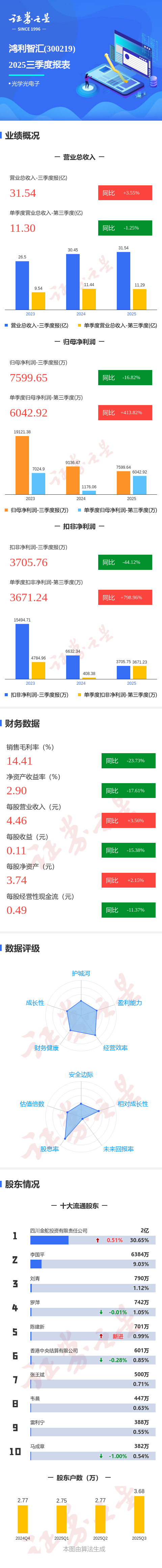 证券之星消息,鸿利智汇2025年三季报显示,公司主营收入31.54亿元,同比上升3.56%;归母净利润7599.65万元,同比下降16.82%;扣非净利润3705.76万元,同比下降44.13%;其中2025年第三季度,公司单季度主营收入11.3亿元,同比下降1.25%;单季度归母净利润6042.92万元,同比上升413.82%;单季度扣非净利润3671.24万元,同比上升798.97%;负债率55.91%,投资收益921.63万元,财务费用-453.56万元,毛利率14.41%。