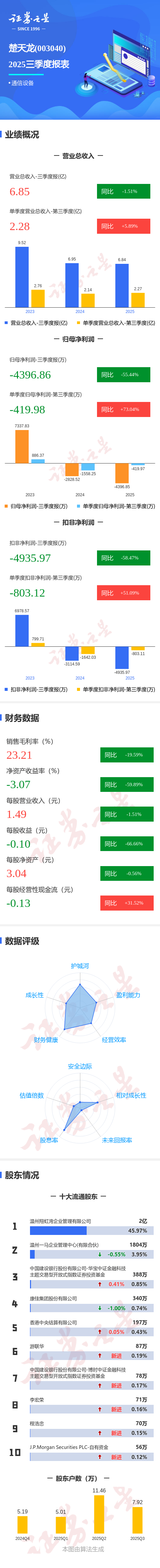 证券之星消息,楚天龙2025年三季报显示,公司主营收入6.85亿元,同比下降1.52%;归母净利润-4396.86万元,同比下降55.45%;扣非净利润-4935.97万元,同比下降58.48%;其中2025年第三季度,公司单季度主营收入2.28亿元,同比上升5.89%;单季度归母净利润-419.98万元,同比上升73.05%;单季度扣非净利润-803.12万元,同比上升51.09%;负债率26.38%,投资收益260.11万元,财务费用-301.09万元,毛利率23.21%。