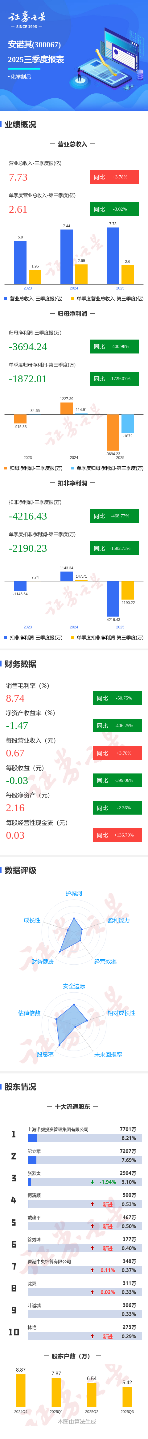 证券之星消息,安诺其2025年三季报显示,公司主营收入7.73亿元,同比上升3.78%;归母净利润-3694.24万元,同比下降400.98%;扣非净利润-4216.43万元,同比下降468.78%;其中2025年第三季度,公司单季度主营收入2.61亿元,同比下降3.03%;单季度归母净利润-1872.01万元,同比下降1729.07%;单季度扣非净利润-2190.23万元,同比下降1582.73%;负债率28.87%,投资收益-46.01万元,财务费用1333.27万元,毛利率8.74%。
