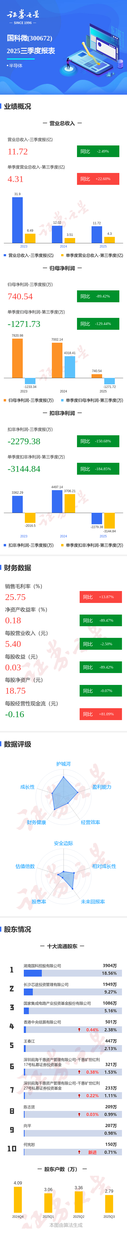 证券之星消息,国科微2025年三季报显示,公司主营收入11.72亿元,同比下降2.5%;归母净利润740.54万元,同比下降89.42%;扣非净利润-2279.38万元,同比下降150.69%;其中2025年第三季度,公司单季度主营收入4.31亿元,同比上升22.6%;单季度归母净利润-1271.73万元,同比下降129.45%;单季度扣非净利润-3144.84万元,同比下降184.85%;负债率46.64%,投资收益4241.43万元,财务费用2197.31万元,毛利率25.75%。
