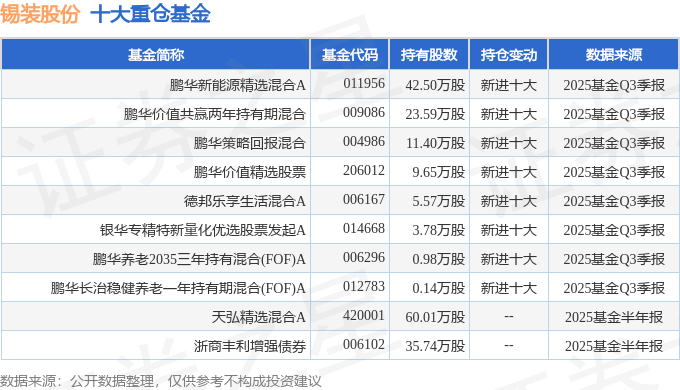 持有锡装股份最多的基金为鹏华新能源精选混合A,目前规模为6.07亿元,最新净值1.1759(10月27日),较上一交易日上涨0.54%,近一年上涨42.74%。该基金现任基金经理为张宏钧。