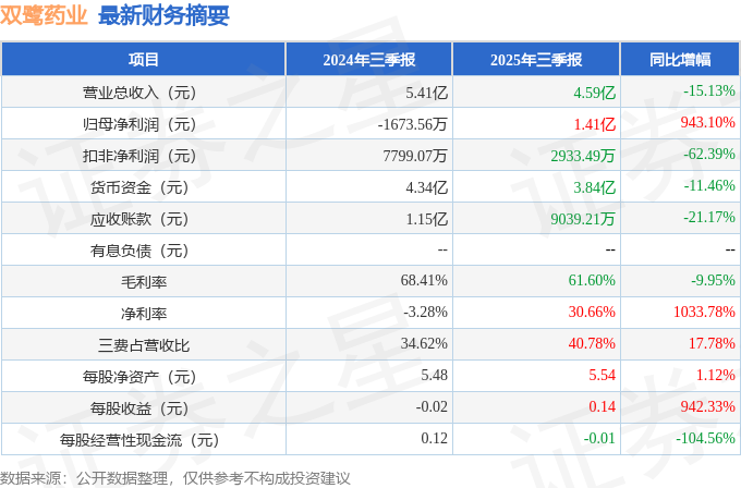 据证券之星公开数据整理,近期双鹭药业(002038)发布2025年三季报。截至本报告期末,公司营业总收入4.59亿元,同比下降15.13%,归母净利润1.41亿元,同比上升943.1%。按单季度数据看,第三季度营业总收入1.54亿元,同比上升3.63%,第三季度归母净利润2004.98万元,同比上升143.28%。本报告期双鹭药业存货明显上升,存货同比增幅达66.7%。