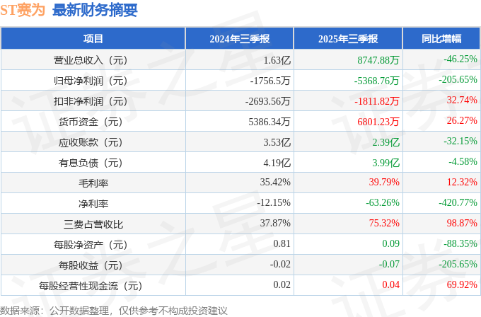 据证券之星公开数据整理,近期ST赛为(300044)发布2025年三季报。截至本报告期末,公司营业总收入8747.88万元,同比下降46.25%,归母净利润-5368.76万元,同比下降205.65%。按单季度数据看,第三季度营业总收入2509.29万元,同比下降3.18%,第三季度归母净利润-2782.77万元,同比下降102.31%。本报告期ST赛为三费占比上升明显,财务费用、销售费用和管理费用总和占总营收同比增幅达98.87%。