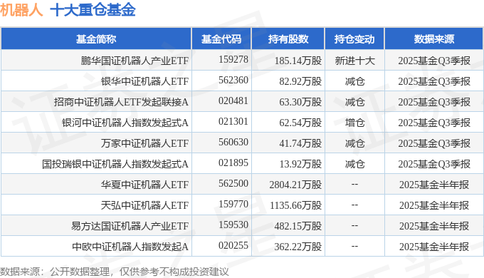 持有机器人最多的基金为鹏华国证机器人产业ETF,目前规模为8.39亿元,最新净值1.1064(10月27日),较上一交易日上涨1.22%。该基金现任基金经理为陈龙。