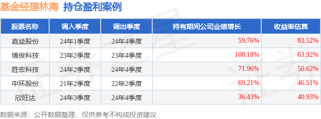 林海管理的易方达趋势优选混合A基金在24年1季度买入嘉益股份,在持有3个季度后在24年4季度卖出。持有期间的估算收益率为83.52%,持有期间嘉益股份在2023年到2024年的年报营业总收入增幅达59.76%。