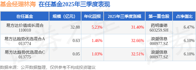 证券之星消息,截止2025年三季度末,基金经理林海旗下共管理3只基金,本季度表现最佳的为易方达趋势优选混合A(013774),季度净值涨32.66%。