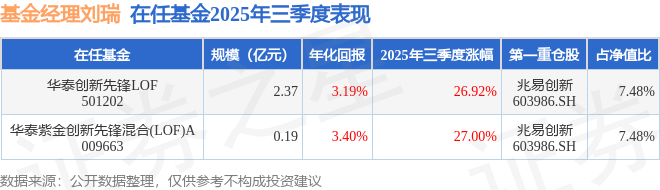 证券之星消息,截止2025年三季度末,基金经理刘瑞旗下共管理2只基金,本季度表现最佳的为华泰紫金创新先锋混合(LOF)A(009663),季度净值涨27.0%。