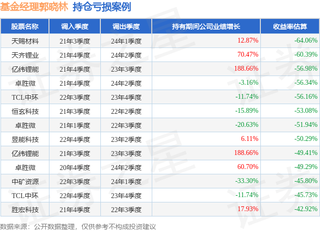 郭晓林管理的博时新能源汽车主题混合A基金在21年3季度买入天赐材料,在持有2年又2个季度后在24年1季度卖出。持有期间的估算收益率为-64.06%,持有期间天赐材料在2021年到2024年的年报营业总收入增幅达12.87%。