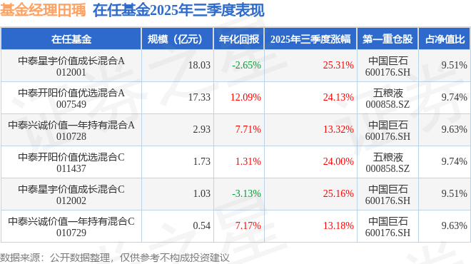 证券之星消息,截止2025年三季度末,基金经理田瑀旗下共管理6只基金,本季度表现最佳的为中泰星宇价值成长混合A(012001),季度净值涨25.31%。