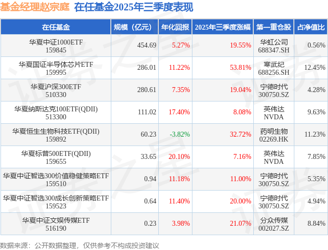 赵宗庭管理的华夏中证1000ETF基金在21年2季度买入星源材质,在持有1个季度后在21年3季度卖出。持有期间的估算收益率为97.42%,持有期间星源材质在2020年到2021年的年报归属净利润增幅达133.49%。