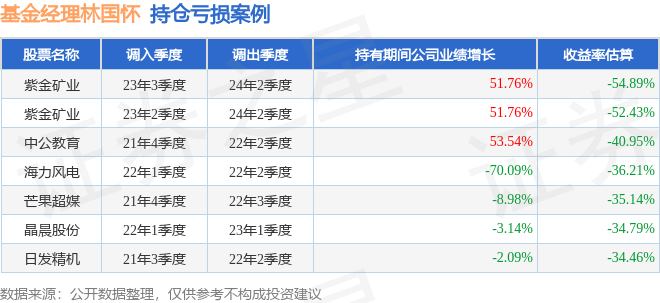 林国怀管理的兴证全球积极配置混合(FOF-LOF)A基金在23年3季度买入紫金矿业,在持有3个季度后在24年2季度卖出。持有期间的估算收益率为-54.89%,持有期间紫金矿业在2023年到2024年的年报归属净利润增幅达51.76%。