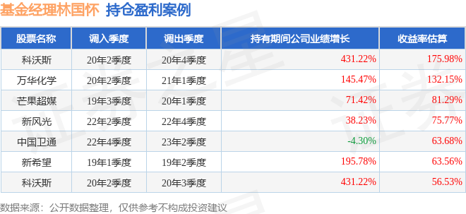 林国怀管理的兴全优选进取三个月持有(FOF)A基金在20年2季度买入科沃斯,在持有2个季度后在20年4季度卖出。持有期间的估算收益率为175.98%,持有期间科沃斯在2019年到2020年的年报归属净利润增幅达431.22%。