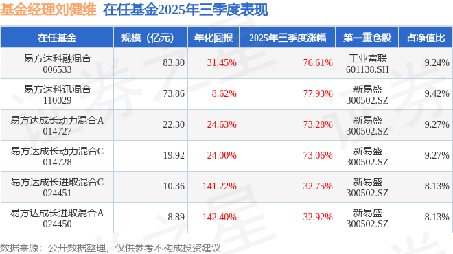 证券之星消息,截止2025年三季度末,基金经理刘健维旗下共管理6只基金,本季度表现最佳的为易方达科讯混合(110029),季度净值涨77.93%。