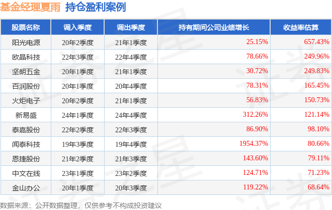 夏雨管理的工银战略新兴产业混合A基金在20年2季度买入阳光电源,在持有3个季度后在21年1季度卖出。持有期间的估算收益率为657.43%,持有期间阳光电源在2020年到2021年的年报营业总收入增幅达25.15%。