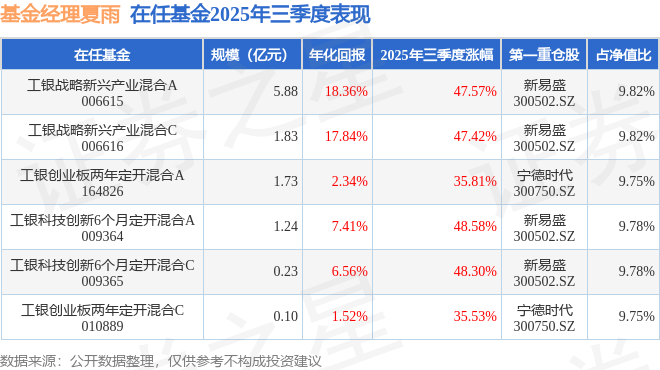 证券之星消息,截止2025年三季度末,基金经理夏雨旗下共管理6只基金,本季度表现最佳的为工银科技创新6个月定开混合A(009364),季度净值涨48.58%。