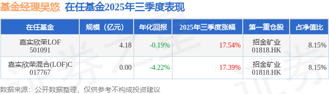 证券之星消息,截止2025年三季度末,基金经理吴悠旗下共管理2只基金,本季度表现最佳的为嘉实欣荣LOF(501091),季度净值涨17.54%。