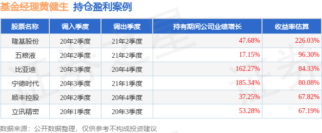 黄健生管理的易方达量化策略A基金在20年2季度买入隆基股份,在持有1年又0个季度后在21年2季度卖出。持有期间的估算收益率为226.03%,持有期间隆基股份在2020年到2021年的年报营业总收入增幅达47.68%。