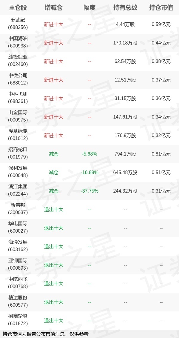 证券之星消息,10月28日华泰柏瑞基金旗下郑青 董辰 闫泽君管理的华泰柏瑞鼎利灵活配置混合型基金公布三季报,近1年净值增长率3.17%。与上一季度相比,该基金前十大重仓股新增寒武纪,中国海油,赣锋锂业,中微公司,中科飞测,山金国际,隆基绿能;其中招商蛇口持仓占比0.69%,为该基金第一大重仓股;新宙邦,华电国际,海通发展,亚钾国际,中航西飞,精达股份,招商轮船等退出前十大重仓股;详细数据如下: