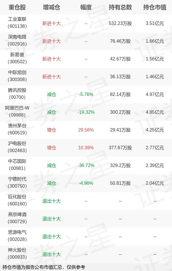 证券之星消息,10月28日易方达基金旗下彭珂管理的易方达研究精选股票型基金公布三季报,近1年净值增长率26.3%。与上一季度相比,该基金前十大重仓股新增工业富联,深南电路,新易盛,中际旭创;其中腾讯控股持仓占比9.92%,为该基金第一大重仓股;巨化股份,燕京啤酒,思源电气,神火股份等退出前十大重仓股;详细数据如下:
