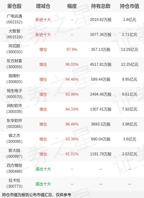 证券之星消息,10月28日华宝基金旗下陈建华 曹旭辰管理的华宝中证金融科技主题交易型开放式指数基金公布三季报,近1年净值增长率32.75%。与上一季度相比,该基金前十大重仓股新增广电运通,大智慧;并对同花顺增仓176.67万股,为该基金第一大重仓股;四方精创,拉卡拉等退出前十大重仓股;详细数据如下: