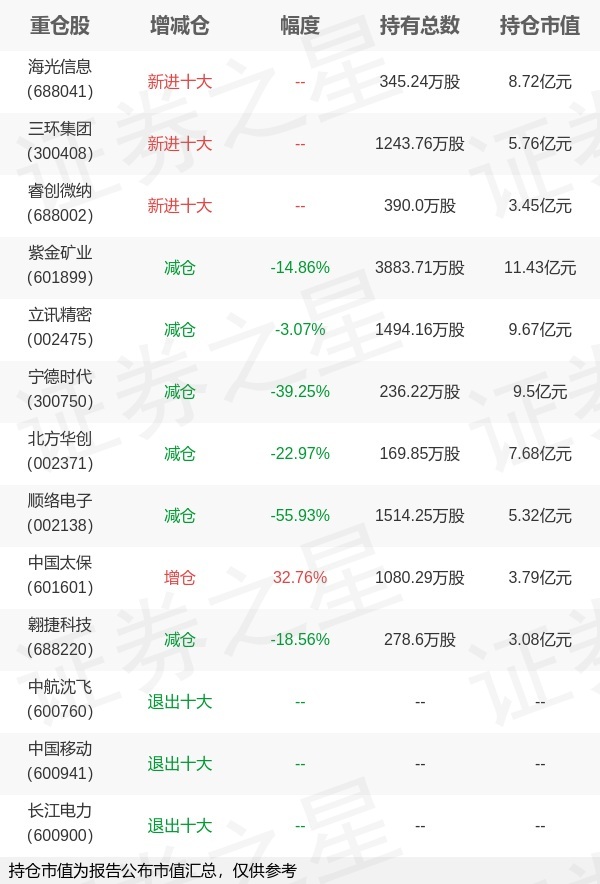 证券之星消息,10月28日兴证全球基金旗下杨世进 谢长雁管理的兴全趋势投资混合型基金公布三季报,近1年净值增长率18.38%。与上一季度相比,该基金前十大重仓股新增海光信息,三环集团,睿创微纳;其中紫金矿业持仓占比7.55%,为该基金第一大重仓股;中航沈飞,中国移动,长江电力等退出前十大重仓股;详细数据如下: