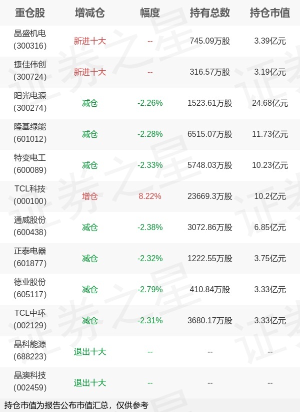 证券之星消息,10月28日华泰柏瑞基金旗下李茜 李沐阳管理的华泰柏瑞中证光伏产业交易型开放式指数基金公布三季报,近1年净值增长率5.36%。与上一季度相比,该基金前十大重仓股新增晶盛机电,捷佳伟创;其中阳光电源持仓占比17.66%,为该基金第一大重仓股;晶科能源,晶澳科技等退出前十大重仓股;详细数据如下: