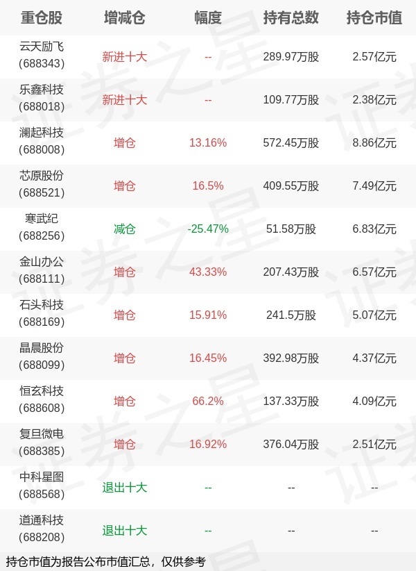 证券之星消息,10月28日博时基金旗下李庆阳管理的博时上证科创板人工智能交易型开放式指数基金公布三季报。与上一季度相比,该基金前十大重仓股新增云天励飞,乐鑫科技;并对澜起科技增仓66.59万股,为该基金第一大重仓股;中科星图,道通科技等退出前十大重仓股;详细数据如下: