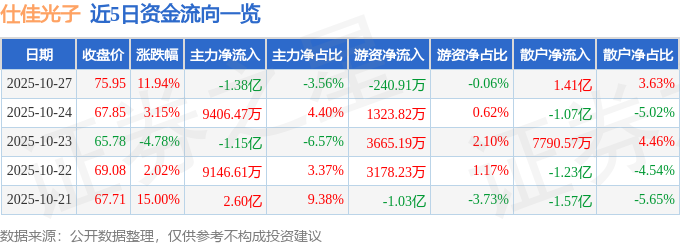 证券之星消息,截至2025年10月27日收盘,仕佳光子(688313)报收于75.95元,上涨11.94%,换手率11.11%,成交量50.98万手,成交额38.85亿元。