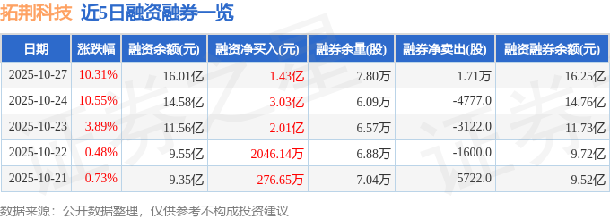 拓荆科技融资融券信息显示,融资方面,当日融资买入5.38亿元,融资偿还3.96亿元,融资净买入1.43亿元,净买入额两市排名第19,连续3日净买入累计6.46亿元。融券方面,融券卖出1.75万股,融券偿还400.0股,融券余量7.8万股,融券余额2459.7万元。融资融券余额16.25亿元。