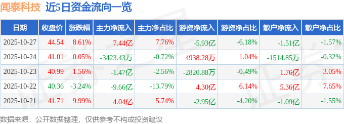 10月27日的资金流向数据方面,主力资金净流入7.44亿元,占总成交额7.76%,游资资金净流出5.93亿元,占总成交额6.18%,散户资金净流出1.51亿元,占总成交额1.57%。