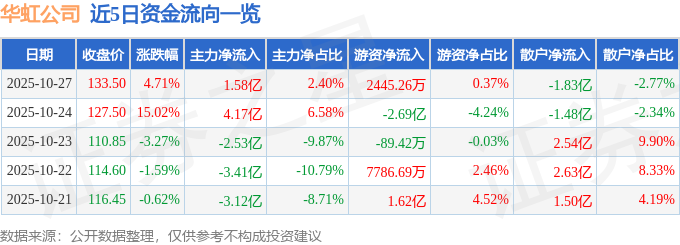 10月27日的资金流向数据方面,主力资金净流入1.58亿元,占总成交额2.4%,游资资金净流入2445.26万元,占总成交额0.37%,散户资金净流出1.83亿元,占总成交额2.77%。